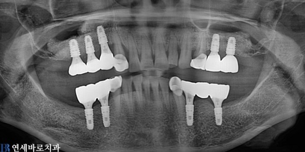 뼈이식과 상악동 거상술 임플란트 식립을 하여 총 임플란트 9개를 식립하였습니다.